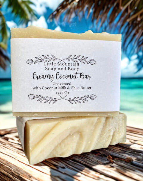 Pamper your skin with the pure, gentle touch of our unscented Coconut Milk and Shea Butter bar of soap. Enriched with nourishing shea butter, this soap bar offers a creamy lather that moisturizes and soothes. Its delicate formula is perfect for all skin types, but is especially great for this with sensitive skin conditions as it provides a kind, mild cleanse that respects your skin’s natural balance. Unscented, it’s the ideal choice for those who prefer the subtle, natural beauty of unscented skincare.