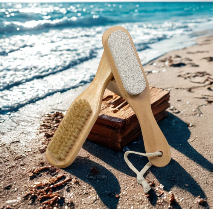 This wooden brush has two sides: one with a brush and the other with a pumice stone. It is the perfect way to scrub and exfoliate your feet! With this brush you can exfoliate calluses and dry skin with the pumice stone and then flip over the brush and use the natural boar bristles on the other side to clean your nails. It has a rope to hang after use. 18 cm long.