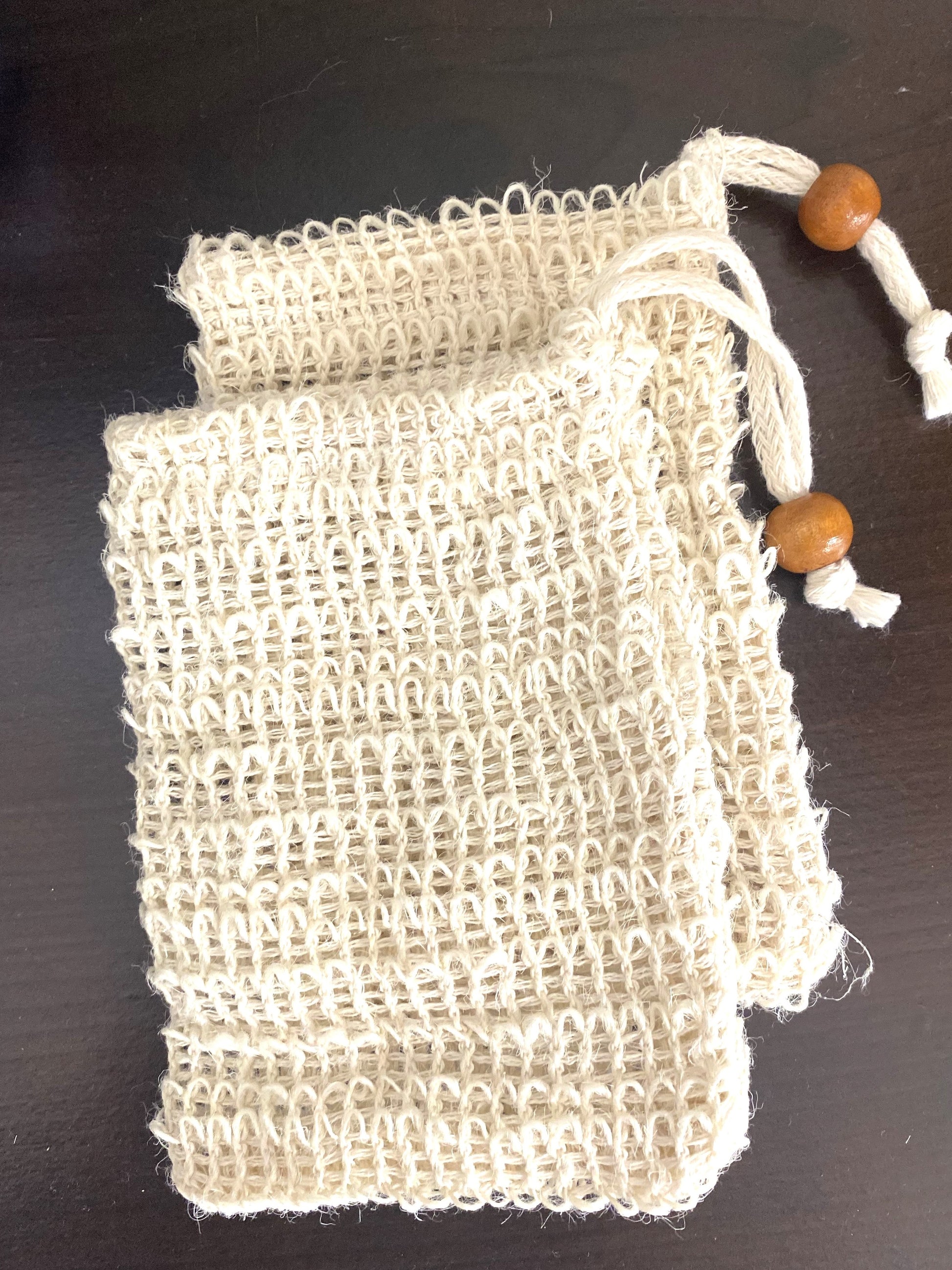 These bags are constructed from natural fibers and are great for scrubbing and exfoliating your skin. You can put your soap ends in it or a whole bar of soap. Has a cotton string for hanging and will get softer with each use. 14 cm x 9 cm