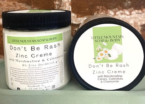 This thick, white creme contains 8% Zinc Oxide. Zinc oxide is a natural mineral known to be antiseptic, protectant and anti-inflammatory. New studies show that Zinc Oxide also increases the production of collagen, helping to repair skin. This creme also contains marshmallow root powder which has been used for centuries to soothe redness, calm irritated skin and lock in moisture. Calendula and chamomile offer even more calming and anti-inflammatory benefits. Allantoin is an amazing because it locks in even more moisture and is approved by the FDA to relieve chapped skin, sunburns and all sorts of rashes. We can't forget aloe vera for it's powerful calming and regenerative benefits! This product is lightly scented with chamomile essential oil.